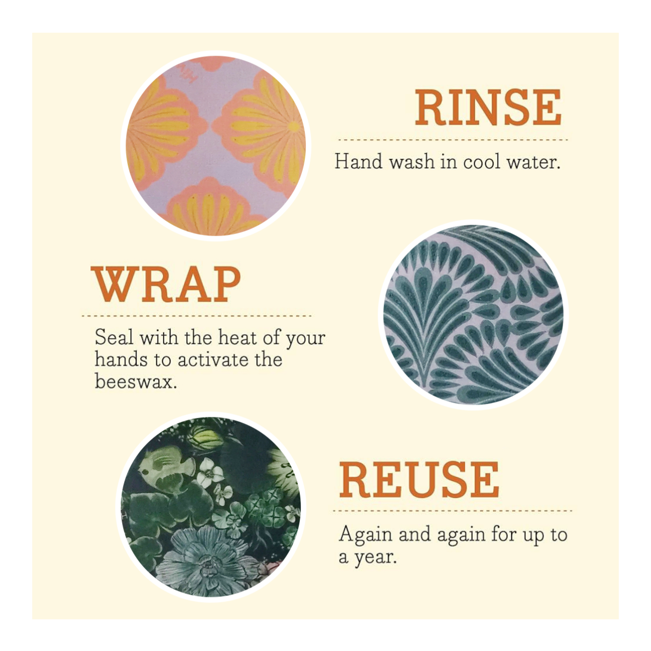 Wash wraps in cool water with mild dish soap and air dry. Avoid using warm water or washing in dish washer.